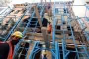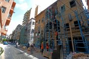 Para pekerja memperbaiki bangunan yang rusak akibat ledakan di Beirut, Lebanon, Jumat (21/8/2020). Warga Lebanon memulai upaya rekonstruksi menyusul ledakan pada 4 Agustus yang mengguncang Pelabuhan Beirut dan menewaskan sedikitnya 177 orang. ANTARA FOTO/Xinhua-Bilal Jawich/hp.