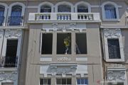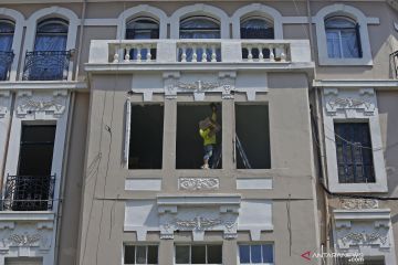 Seorang pekerja memperbaiki bangunan yang rusak akibat ledakan di Beirut, Lebanon, Jumat (21/8/2020). Warga Lebanon memulai upaya rekonstruksi menyusul ledakan pada 4 Agustus yang mengguncang Pelabuhan Beirut dan menewaskan sedikitnya 177 orang. ANTARA FOTO/Xinhua-Bilal Jawich/hp.