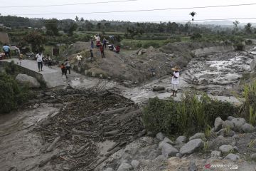 Warga membersihkan material lahar dingin di Desa Gurukinayan, Kabupaten Karo, Sumatera Utara, Sabtu (22/8/2020). Akibat banjir lahar dingin tersebut jalur transportasi antar kecamatan sempat terputus. ANTARA FOTO/Adiva Niki/wsj.