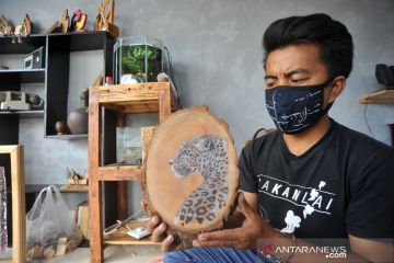 Seorang perajin Zulfikar menunjukan hasil lukisannya di atas potongan kayu di Nagari Paninjauan, Kabupaten Tanah Datar, Sumatera Barat, Senin (24/8/2020). Zulfikar mengembangkan usaha kerajinannya dengan nama "Mato Kayoe" yang memanfaatkan limbah kayu, namun bisa dijadikan hasil kerajinan dan karya seni sehingga dapat dijual hingga jutaan rupiah. ANTARA FOTO/Iggoy el Fitra/aww.