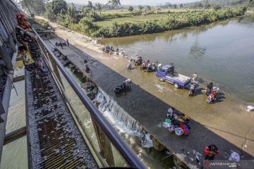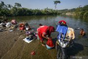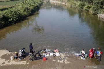 Sejumlah warga mencuci pakaian di aliran Sungai Cileungsi, Citeureup, Bogor, Jawa Barat, Selasa (25/8/2020). Musim kemarau membuat sebagian warga di kawasan tersebut terpaksa mencuci dan mandi di air sungai karena sumur di rumah mereka mulai mengering. ANTARA FOTO/Yulius Satria Wijaya/wsj.
