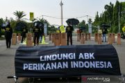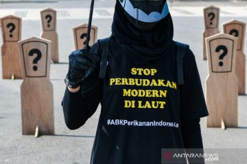 Aktivis buruh yang tergabung dalam Serikat Buruh Migran Indonesia (SBMI) dan Greenpeace Indonesia melakukan aksi damai di depan Istana Merdeka, Jakarta, Kamis (27/8/2020). Mereka menuntut Presiden Joko Widodo untuk segera mengesahkan Rancangan Peraturan Pemerintah tentang perlindungan anak buah kapal (ABK) asal Indonesia yang bekerja di kapal ikan berbendera asing. ANTARA FOTO/M Risyal Hidayat/hp.