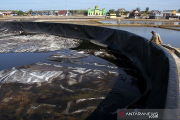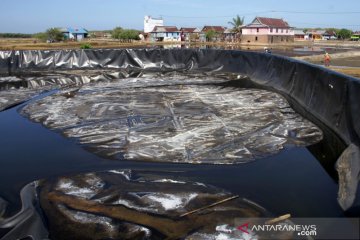 Warga melihat embung yang mengering di Kecamatan Bontoa, Kabupaten Maros, Sulawesi Selatan, Kamis (27/8/2020). Sejumlah embung yang menjadi sumber air bersih di daerah itu mengering akibat kemarau sehingga warga setempat terpaksa membeli air bersih untuk kebutuhan sehari-hari. ANTARA FOTO/Arnas Padda/foc.