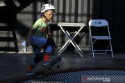 Seorang anak yang mengenakan pelindung wajah berlatih skateboard di Crooz Shophouse, Jakarta, Jumat (28/8/2020). Sekolah skateboard Crooz kembali melakukan pelatihan dengan jumlah anak didik yang terbatas dan menerapkan protokol kesehatan. ANTARA FOTO/M Risyal Hidayat/aww.