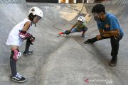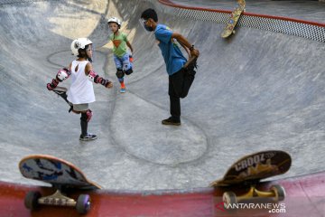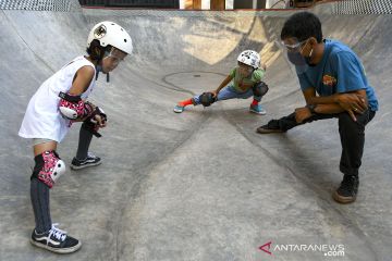 Seorang instruktur dan anak didiknya melakukan pemanasan sebelum berlatih skateboard di Crooz Shophouse, Jakarta, Jumat (28/8/2020). Sekolah skateboard Crooz kembali melakukan pelatihan dengan jumlah anak didik yang terbatas dan menerapkan protokol kesehatan. ANTARA FOTO/M Risyal Hidayat/aww.