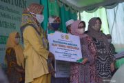 Bupati Jombang, Munjidah Wahab (kedua kanan) didampingi anggota Komisi IV DPR RI, Ema Umiyyatul Chusna (kanan) menyerahkan bantuan alat dan mesin pertanian (Alsintan) dari Kementerian Pertanian kepada kelompok tani di Kabupaten Jombang, Jawa Timur, Sabtu (29/8/2020). Penyerahan bantuan Alsintan berupa, hand traktor, traktor roda 4, serta mesin panen padi untuk mendongkrak produksi pertanian. ANTARA FOTO/Syaiful Arif/hp.