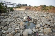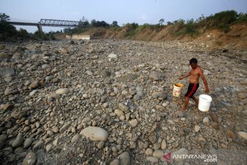 Warga mengambil air dari dasar Sungai Cipamingkis yang mengering di Jonggol, Kabupaten Bogor, Jawa Barat, Minggu (30/8/2020). Sebagian besar warga di wilayah tersebut memanfaatkan air dari dasar dan sisa aliran sungai Cipamingkis yang mengering di musim kemarau untuk kebutuhan mencuci dan mandi. ANTARA FOTO/Yulius Satria Wijaya/aww.