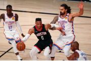 Pebasket Houston Rockets Russell Westbrook (kedua kiri) membawa bola dan berupaya melewati penjagaan pebasket Oklahoma City Thunder Dennis Schroder (kiri), Steven Adams (kedua kanan) dan Chris Paul (kanan) dalam laga gim ketujuh playoff NBA, di Lake Buena Vista, Florida, Amerika Serikat, Rabu (2/9/2020). Houston Rockets unggul 4-3 atas Oklahoma City Thunder setelah menang 104 - 102. ANTARA FOTO/Reuters-Kim Klement-USA TODAY Sports/hp.
