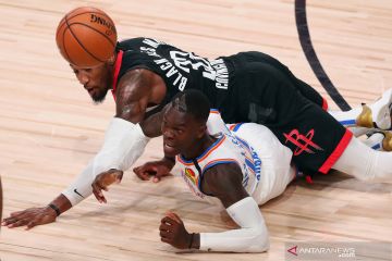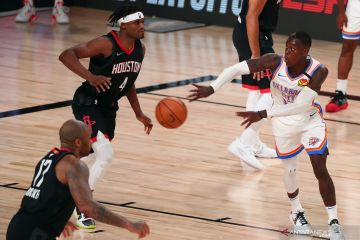 Pebasket Houston Rockets Robert Covington (kiri) dan pebasket Oklahoma City Thunder Dennis Schroder (kanan) berebut bola dalam laga gim ketujuh playoff NBA, di ESPN Wide World of Sports Complex, Lake Buena Vista, Florida, Amerika Serikat, Rabu (2/9/2020). Houston Rockets unggul 4-3 atas Oklahoma City Thunder setelah menang 104 - 102. ANTARA FOTO/Reuters-Kim Klement-USA TODAY Sports/hp.