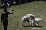 Dua domba beradu kepala saat kontes ternak di Kabupaten Garut, Jawa Barat, Minggu (6/9/2020). Selain pelestarian tradisi, laga adu domba tersebut juga sebagai ajang pencarian domba berkualitas untuk dijual dengan nilai tinggi. ANTARA FOTO/Candra Yanuarsyah/aww.