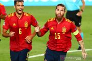 Pesepak bola Spanyol Sergio Ramos (kanan) melakukan selebrasi bersama rekannya Mikel Merino setelah berhasil mencetak gol ke gawang Ukraina dalam laga UEFA National League A group 4, di Stadion Alfredo Di Stefano, Madrid, Spayol, Minggu (6/9/2020). Spanyol berhasil mengalahkan Ukraina 4-0. ANTARA FOTO/Reuters-Sergio Perez/hp.