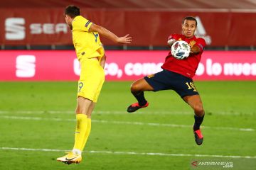 Pesepak bola Spanyol Thiago Alcantara (kanan) berebut bola denga pesepak bola Ukraina Roman Yaremchuk (kiri) dalam laga UEFA National League A group 4, di Stadion Alfredo Di Stefano, Madrid, Spayol, Minggu (6/9/2020). Spanyol berhasil mengalahkan Ukraina 4-0. ANTARA FOTO/Reuters-Sergio Perez/hp.