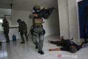 Prajurit Batalyon Intai Amfibi 2 Marinir (Yontaifib 2 Mar) membebaskan sandera dalam pertempuran jarak dekat saat latihan penanggulangan teror, di Bhumi Marinir Karang Pilang, Surabaya, Jawa Timur, Selasa (8/9/2020). Selain bertujuan untuk meningkatkan kemampuan tempur perorangan maupun tim, latihan tersebut dalam rangka menyiapkan prajurit TNI khususnya Batalyon Intai Amfibi 2 Marinir dalam mengatasi aksi terorisme di Indonesia. ANTARA FOTO/Moch Asim/pras.