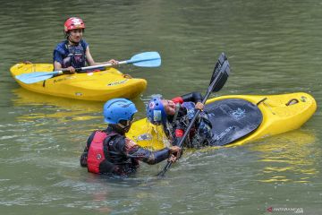 Pelatih Cabang Olahraga Kayak Asep Maksum Karnawisastra (tengah) melatih Heni Marlina (kanan) dan Hadi Iskandar di Sungai Ciwulan, Kota Tasikmalaya, Jawa Barat, Kamis (10/9/2020). Pegiat kayak yang tergabung dalam Tasikmalaya Kayak Team itu mulai berlatih selama pandemi COVID-19 untuk mempersiapkan diri mengikuti kejuaraan nasional dan Eddieline Games (EG) 2021 mendatang di Pekalongan, Jawa Tengah. ANTARA FOTO/Adeng Bustomi/hp.