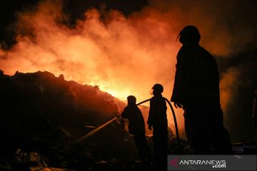 Petugas memadamkan api yang membakar gudang limbah busa di Pasar Kemis, Kabupaten Tangerang, Banten, Kamis (10/9/2020). Kebakaran gudang limbah busa kasur tersebut diduga akibat korsleting aki mobil. ANTARA FOTO/Fauzan/pras.