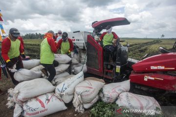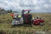 Petani memanen padi menggunakan alat mesin pertanian (alsintan) saat panen raya di areal persawahan lumbung pangan nasional 'Food Estate' di Desa Belanti Siam, Kabupaten Pulang Pisau, Kalimantan Tengah, Sabtu (12/9/2020). Panen raya di areal 'Food Estate' tersebut stabil meski di tengah pandemi COVID-19 dan menghasilkan total 12 ton padi jenis hibrida dari lahan dua hektare. ANTARA FOTO/Makna Zaezar/pras.