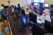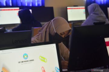Sejumlah siswa mengerjakan ujian Penilaian Tengah Semester (PTS) di SMP N 4 Kudus, Kudus, Jawa Tengah, Selasa (15/9/2020). Ujian PTS yang seharusnya dilakukan di rumah masing-masing secara daring guna menghindari penyebaran COVID-19 itu terpaksa dikerjakan di sekolah karena siswa terkendala jaringan intenet dan beberapa siswa tidak mempunyai telepon seluler untuk mengakses ujian tersebut. ANTARA FOTO/Yusuf Nugroho/wsj.