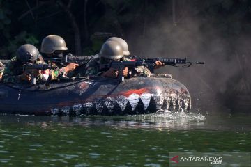 Prajurit Brigif 2 Marinir menembak di atas perahu karet saat Latihan Satuan Lanjutan (LSL) I TW II tahun 2020 di daerah latihan Korps Marinir pantai Baruna Kondang Iwak, Malang Selatan, Jawa Timur, Rabu (16/9/2020). Latihan tersebut bertujuan untuk meningkatkan profesionalisme prajurit Brigif 2 Marinir sebagai pasukan pendarat amfibi Korps Marinir. ANTARA FOTO/Serka Mar Kuwadi/hp.