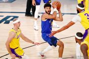 Pebaket Denver Nuggets Jamal Murray (tengah) bersiap mengoper bola ke rekannya dan dijaga pebasket Los Angeles Lakers Anthony Davis (kanan) dalam laga final gim pertama wilayah Barat Playoff NBA 2020, di AdventHealth Arena, Lake Buena Vista, Florida, Amerika Serikat (Jumat (18/9/2020). LA Lakers sementara memimpin 1-0 setelah mengalahkan Denver Nuggets 126 - 114. ANTARA FOTO/Reuters- Kim Klement-USA TODAY Sports/hp.
