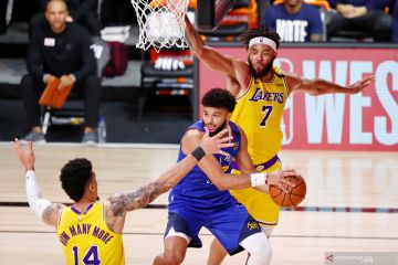 Pebasket Los Angeles Lakers Anthony Davis (kiri) berupaya memasukkan bola ke ring lawan dan di jaga pebasket Denver Nuggets Nikola Jokic (kedua kanan) dalam laga final gim pertama wilayah Barat Playoff NBA 2020, di AdventHealth Arena, Lake Buena Vista, Florida, Amerika Serikat, (Jumat (18/9/2020). LA Lakers sementara memimpin 1-0 setelah mengalahkan Denver Nuggets 126 - 114 . ANTARA FOTO/Reuters- Kim Klement-USA TODAY Sports/hp