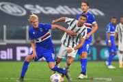 Pesepak bola Juventus Cristiano Ronaldo (kedua kiri) berupaya melewati penjagaan pesepak bola Sampdoria Morten Thorsby (kiri) dan Albin Ekdal dalam laga pekan pertama Liga Italia, di Allianz Stadium, Turin, Italia, Minggu (20/9/2020). Juventus berhasil mengalahkan Sampdoria 3-0 dan Ronaldo menyumbang satu gol dalam pertandingan ini. ANTARA FOTO/Reuters- /Massimo Pinca/hp.