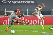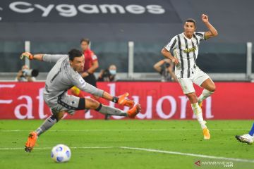 Pesepak bola Juventus Cristiano Ronaldo (kanan) menendang bola dan berhasil mencetak gol ke gawang Sampdoria yang di jaga Emil Audero (kiri) dalam laga pekan pertama Liga Italia, di Allianz Stadium, Turin, Italia, Minggu (20/9/2020). Juventus berhasil mengalahkan Sampdoria 3-0 dan Ronaldo menyumbang satu gol dalam pertandingan ini. ANTARA FOTO/Reuters- /Massimo Pinca/hp.