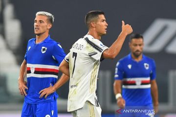 Pesepak bola Juventus Cristiano Ronaldo (tengah) melakukan selebrasi setelah berhasil mencetak gol ke gawang Sampdoria dalam laga pekan pertama Liga Italia, di Allianz Stadium, Turin, Italia, Minggu (20/9/2020). Juventus berhasil mengalahkan Sampdoria 3-0 dan Ronaldo menyumbang satu gol dalam pertandingan ini. ANTARA FOTO/Reuters- /Massimo Pinca/hp.