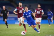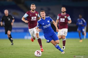 Pesepak bola Leicester City Jamie Vardy (tengah) membawa bola dan dibayang-bayangi pesepak bola Burnley Jay Rodriguez (kedua kiri) dalam laga pekan kedua Liga Inggris, di Stadion King Power, Leicester, Inggris, Minggu (20/9/2020). Leicester berhasil mengalahkan Burnley 4-2. ANTARA FOTO/Pool via Reuters-Laurence Griffiths/hp.