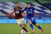 Pesepak bola Leicester City Harvey Barnes (kanan) berebut bola dengan pesepak bola Burnley Erik Pieters dalam laga pekan kedua Liga Inggris, di Stadion King Power, Leicester, Inggris, Minggu (20/9/2020). Leicester berhasil mengalahkan Burnley 4-2. ANTARA FOTO/Pool via Reuters-Laurence Griffiths/hp.