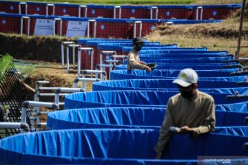 Petugas memeriksa kadar asam dan memberikan pakan di kolam ternak ikan lele di lahan Wisata Pertanian Terpadu Sekemala, Cisurupan, Bandung, Jawa Barat, Senin (21/9/2020). Pemerintah Kota Bandung mengubah lahan seluas dua hektare menjadi lahan wisata pertanian terpadu yang menyuguhkan beragam budidaya ternak ikan seperti lele dan nila serta pertanian yang bertujuan untuk memberikan edukasi kepada masyarakat sekaligus bagian dari program ketahanan pangan di Kota Bandung. ANTARA FOTO/Raisan Al Farisi/hp.