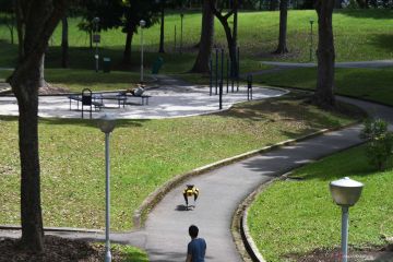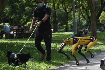 (200922) -- SINGAPURA, 22 September, 2020 (Xinhua) -- Robot anjing bernama SPOT yang dapat mendeteksi apakah pengunjung memakai masker atau tidak menjalani uji coba putaran keduanya di Bishan Park Singapura pada 22 September 2020 sebagai bagian dari upaya melawan penyebaran COVID-19. Selain menjaga jarak sosial yang aman, SPOT telah meningkatkan kemampuan seperti deteksi masker dan pemetaan 3D tanpa teknologi lidar dalam uji coba putaran kedua ini. (Xinhua/Then Chih Wey)