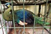 Seekor burung Merak Hijau (Pavo muticus) diamankan petugas Balai Konservasi Sumber Daya Alam (BKSDA) Banten, di Serang, Jumat (25/9/2020). Petugas BKSDA Banten melakukan penindakan terhadap dua pengelola tempat wisata di kawasan Pantai Carita yang memajang satwa-satwa dilindungi untuk menarik pengunjung tanpa surat izin dengan mengamankan dua ekor burung merak, seekor kijang, seekor buaya, seekor kancil dan empat ekor landak. ANTARA FOTO/Asep Fathulrahman/aww.