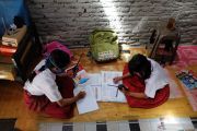 Siswa kelas VI SD Negeri Mojo, Safira (kiri) dan Diva (kanan) menggunakan Handy Talky (HT) saat menyimak materi pelajaran guru pada pembelajaran jarak jauh dari rumahnya di Kampung Semanggi, Solo Jawa Tengah, Selasa (29/9/2020). Pihak sekolah menyediakan fasilitas HT untuk komunikasi dua arah siswa dan guru, guna mendukung pembelajaran jarak jauh saat pandemi COVID-19. ANTARA FOTO/Maulana Surya/wsj.