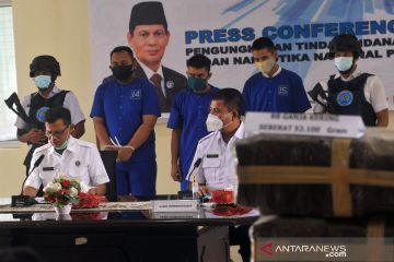 Tersangka pengedar narkotika bersama barang bukti di Kantor BNNP Sumatera Barat, di Padang, Selasa (29/9/2020). BNNP Sumbar mengungkap peredaran narkotika jenis ganja yang dikoordinir oleh seorang narapidana di Lapas Pariaman, dengan barang bukti paket besar ganja kering sebanyak 53,1 kilogram diamankan dari Kabupaten Sijunjung dan Kabupaten Agam. ANTARA FOTO/Iggoy el Fitra/pras.