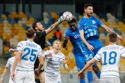 Pesepak bola KAA Gent Tim Kleindienst (kedua kanan) berupaya merebut bola atas saat bertanding melawan Dynamo Kyiv dalam laga play off leg kedua Liga Champions, di Stadion NSC Olympiyskiy, Kyiv, Ukraina, Selasa (29/9/2020). Dynamo Kyiv lolos ke fase group setelah mengalahkan Gent 3-0 dan secara agregat unggul 5-1. ANTARA FOTO/Reuters-Gleb Garanich/hp.