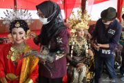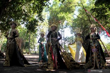 Model memperagakan busana pengantin nusantara di desa Pagerngubluk, Wonoayu, Sidoarjo, Jawa Timur, Kamis (1/10/2020). Peragaan busana tersebut selain untuk memperingati hari Kesaktian Pancasila juga untuk mengenalkan beragam kebudayaan pengantin nusantara kreasi sanggar rias dari berbagai daerah. ANTARA FOTO/Umarul Faruq/hp.