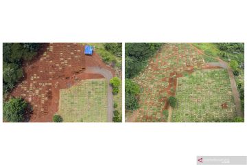 Foto kolase suasana lokasi pemakaman jenazah bagi yang meninggal dunia karena terkait COVID-19 Taman Pemakaman Umum (TPU) Pondok Ranggon pada Minggu (26/4/2020) (kiri) dan suasana lokasi pemakaman jenazah bagi yang meninggal dunia karena terkait COVID-19 TPU Pondok Ranggon di Jakarta, Jumat (2/10/2020) (kanan). Pemerintah Provinsi DKI Jakarta memperluas lahan untuk pemakaman jenazah bagi yang meninggal dunia karena terkait COVID-19 di TPU Pondok Ranggon, dengan pembukaan tahap pertama sekitar 7.141 meter persegi. ANTARA FOTO/Muhammad Adimaja/foc.
