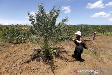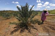 Petani merawat pohon kurma di perkebunan kawasan lembah Berbate, Aceh Besar, Aceh, Minggu (4/10/2020). Sekitar 300 hektare lahan di kawasan lembah Berbate yang berada di kawasan pengunungan Blang Bintang dan Krueng Raya telah ditanami pohon kurma yang didatangkan khusus dari Inggris dan beberapa negara di Timur Tengah. ANTARA FOTO/Irwansyah Putra/aww.
