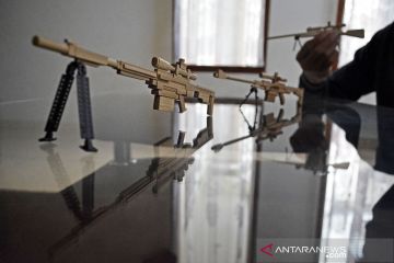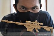 Perajin memperlihatkan miniatur senjata sniper jenis Barrett M82 di Limbangan, Kabupaten Garut, Jawa Barat, Senin (5/10/2020). Miniatur senjata dengan memanfaatkan limbah kayu tersebut dijual mulai Rp25 ribu hingga Rp50 ribu per buah tergantung ukuran dan tingkat kesulitan. ANTARA FOTO/Candra Yanuarsyah/aww.