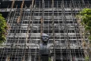 Pekerja memasang steger untuk merenovasi gedung utama Kejaksaan Agung di Jakarta, Rabu (7/10/2020). Kejaksaan Agung mulai melakukan perbaikan gedung utama yang mengalami kebakaran pada 22 Agustus lalu dengan anggaran Rp350 miliar. ANTARA FOTO/Galih Pradipta/wsj.