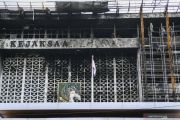 Pekerja melintas di gedung utama Kejaksaan Agung di Jakarta, Rabu (7/10/2020). Kejaksaan Agung mulai melakukan perbaikan gedung utama yang mengalami kebakaran pada 22 Agustus lalu dengan anggaran Rp350 miliar. ANTARA FOTO/Galih Pradipta/wsj.