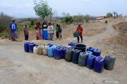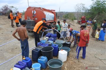 Warga menunggu distribusi air bersih di Desa Jatisari, Arjasa, Situbondo, Jawa Timur, Jumat (9/10/2020). BPBD Situbondo mendistribusikan air bersih ke tiga kecamatan yaitu Kecamatan Arjasa, Mlandingan dan Kendit yang warganya mengalami kesulitan air bersih. ANTARA FOTO/Seno/foc.