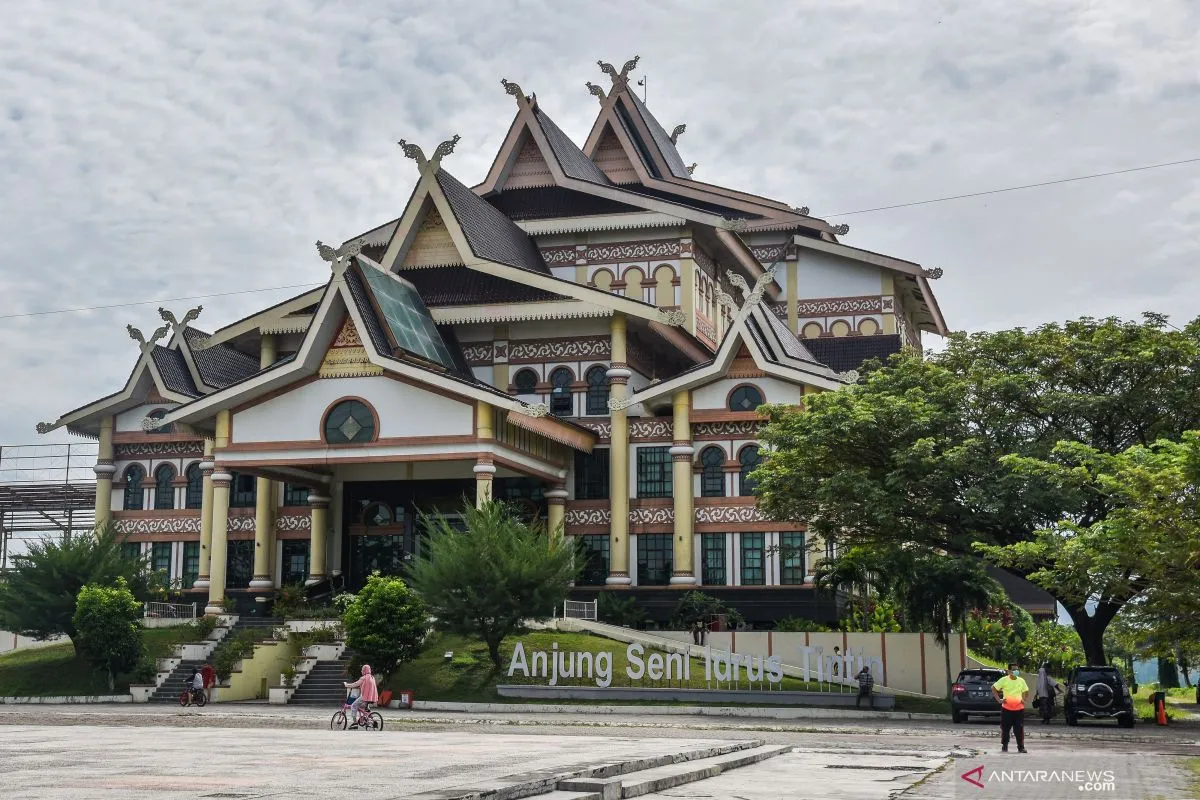 Sejumlah warga beraktivitas di dekat Anjung Seni Idrus Tintin, di Kota Pekanbaru, Riau, Sabtu (10/10/2020). Anjung Seni Idrus Tintin adalah bangunan pertunjukan seni dan budaya yang menjadi ikon di Kota Pekanbaru, karena kemegahan dan bentuk arsitekturnya yang sangat kental dengan corak Melayu Riau. ANTARA FOTO/FB Anggoro/hp.