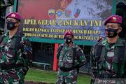 Prajurit TNI AL mengikuti Apel Gelar Pasukan TNI di Lapangan Benteng, Medan, Sumatera Utara, Rabu (14/10/2020). Apel gelar pasukan yang diikuti prajurit TNI AD, TNI AU dan TNI AL tersebut guna membantu personel kepolisian dalam menciptakan suasana aman dan kondusif di wilayah Sumatera Utara. ANTARA FOTO/Irsan Mulyadi/Lmo/hp.