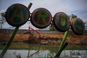 Anggota satgas Citarum Harum sektor enam mengoperasikan ekskavator untuk mengeruk sedimentasi di Daerah Aliran Sungai (DAS) Citarum di Manggahang, Baleendah, Kabupaten Bandung, Jawa Barat, Rabu (14/10/2020). Pengerukan sedimentasi tersebut dilakukan sebagai salah satu langkah antisipasi banjir akibat luapan Sungai Citarum yang kerap kali terjadi saat musim hujan. ANTARA FOTO/Raisan Al Farisi/hp.