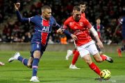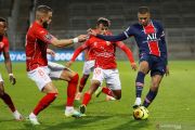 Pesepak bola Paris St Germain Kylian Mbappe (kiri) berupaya mencegah laju serangan dari pesepak bola Nimes Olympique Gaetan Paquiez (kanan) dalam laga lanjutan Liga Prancis, di Stade des Costieres, Nimes, Prancis, Jumat (16/10/2020). PSG mengalahkan Nimes Olympique dan Mbappe sumbang dua gol dalam pertandingan ini. ANTARA FOTO/Reuters-Eric Gaillard/hp.