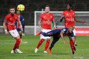 Pesepak bola Paris St Germain Rafinha (kedua kanan) berebut bola dengan pesepak bola Nimes Olympique Patrick Burner dalam laga lanjutan Liga Prancis, di Stade des Costieres, Nimes, Prancis, Jumat (16/10/2020). PSG mengalahkan Nimes Olympique dan Mbappe sumbang dua gol dalam pertandingan ini. ANTARA FOTO/Reuters-Eric Gaillard/hp.