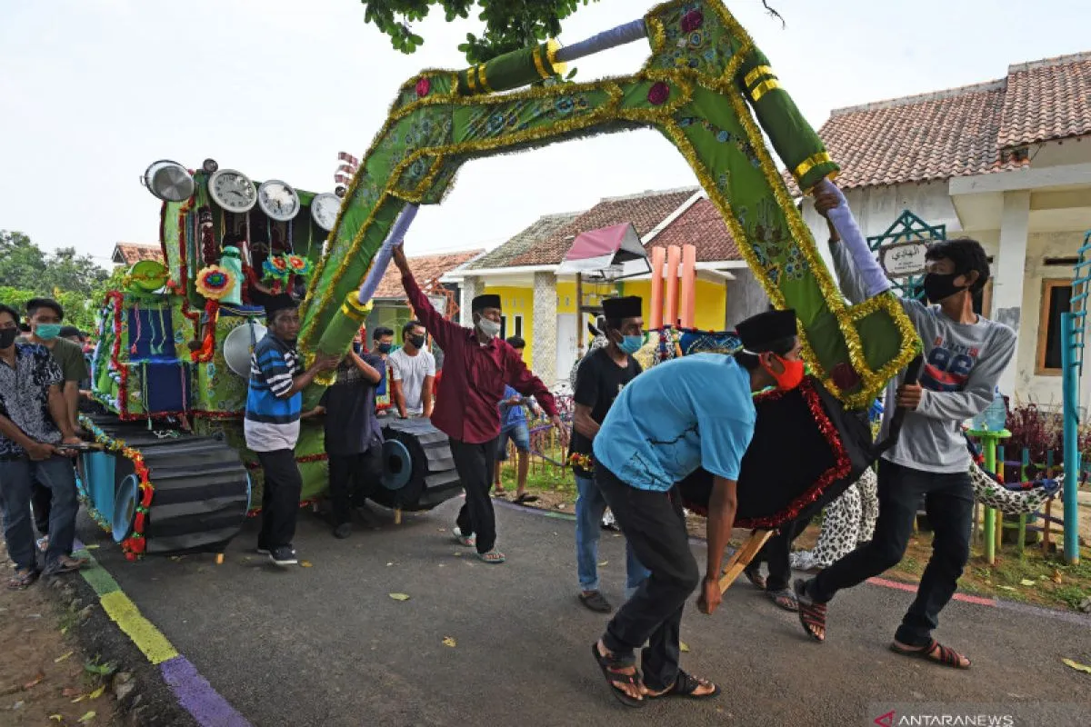 Warga menggotong aneka sedekah yang dibuat seperti replika mobil saat perayaan tradisi Panjang Mulud di Kampung Pekijing, Kalanganyar, Serang, Banten, Sabtu (17/10/2020). Tradisi Panjang Mulud digelar setiap Bulan Mulud pada penanggalan Jawa yang dimaksudkan untuk merayakan Maulid (kelahiran) Nabi Muhammad SAW dengan cara mengumpulkan barang sedekah kemudian diarak keliling kampung untuk dibagikan kepada warga yang kurang mampu. ANTARA FOTO/Asep Fathulrahman/wsj.