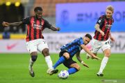 Pesepak bola Inter Milan Lautaro Martinez (tengah) berebut bola dengan pesepak bola AC Milan Franck Kessie (kiri) dalam laga pekan keempat Liga Italia, di Stadion San Siro, Milan, Italia, Sabtu (17/10/2020).MIlan berhasil mengalahkan Inter 2-1 dan kedua gol Milan di cetak oleh Ibrahimovic . ANTARA FOTO/Reuters-Daniele Mascolo/hp.