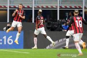 Pesepak bola AC Milan Zlatan Ibrahimovic (kiri) melakukan selebrasi setelah mencetak gol kedua untuk timnya saat melawan Inter Milan dalam laga pekan keempat Liga Italia, di Stadion San Siro, Milan, Italia, Sabtu (17/10/2020). MIlan berhasil mengalahkan Inter 2-1 dan kedua gol Milan di cetak oleh Ibrahimovic . ANTARA FOTO/Reuters-Daniele Mascolo/hp.